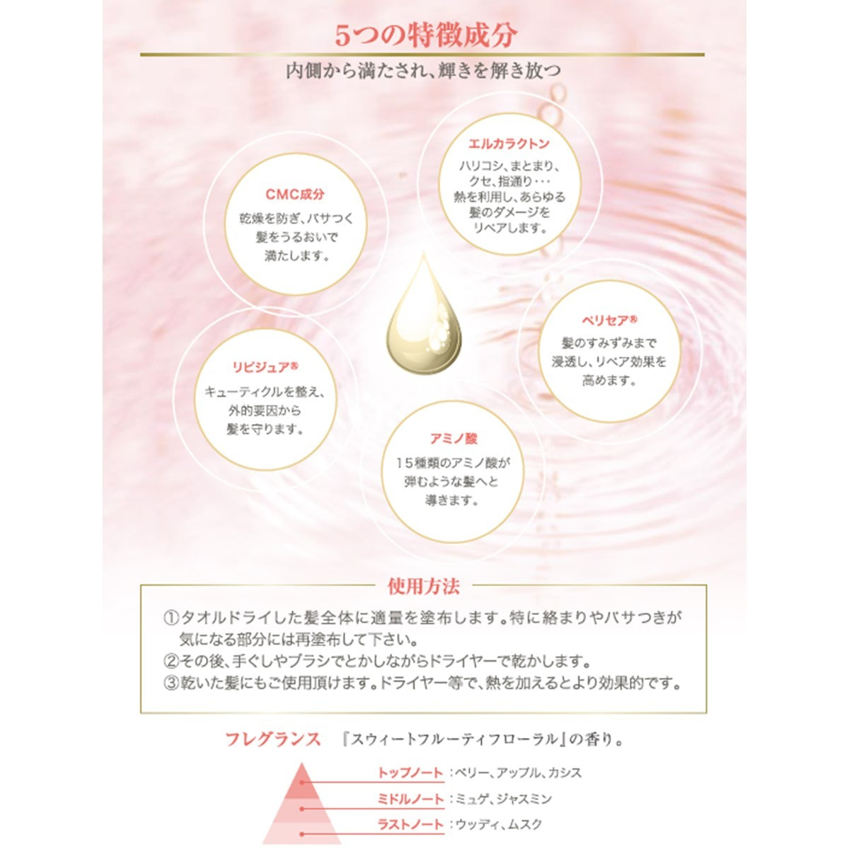 ミスト処方により、髪全体になじみやすく毛髪内部にしっかり浸透。