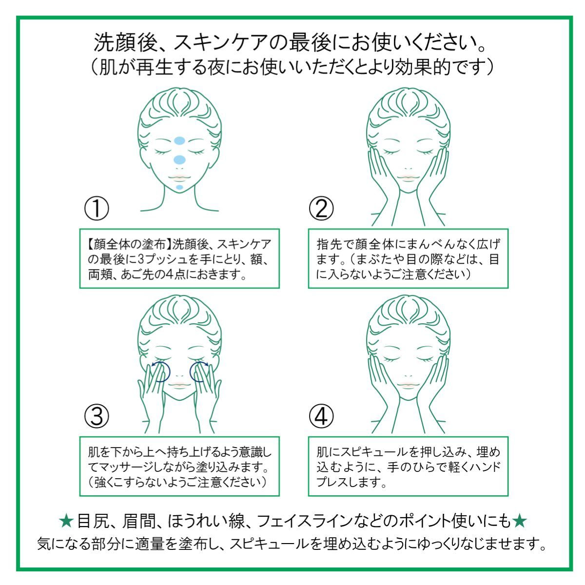 ●本商品使用後には、サウナ、飲酒、お顔のマッサージや美容機器の使用、激しい運動は避けてください。